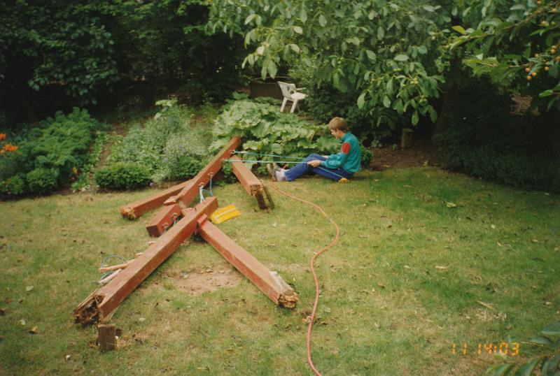 | Ødelagt gyngestativ i haven. Den havde vi brugt i mange år og været kært udflugtsmål for naboens børn. Martin sider på gyngen -- Broken swing in the garden. We did use it many years and it was a very nice trip for the neighbour kids. Martin sits on the swing. |